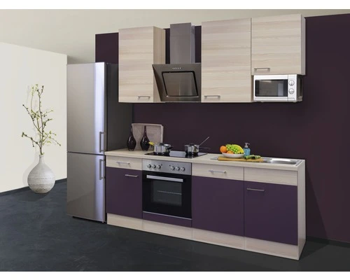 De combinatie van de kleur aubergine met het lichte acaciahouten dessin van front, corpus en werkblad vormt een ultramodern contrast, die van deze keuken een echte eyecatcher maakt. De eenvoudige metalen grepen geven ook een mooie look.