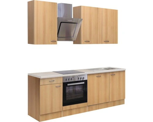 Het warme beukenhouten dessin van front en corpus met het beige stenen dessin van het werkblad past optisch in bijna elke inrichting. De ergonomisch gevormde grepen van het keukenblok maken het beeld van deze keuken compleet.