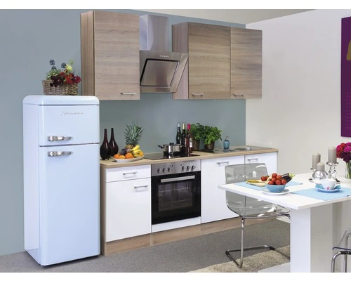 Een matwit front met het Sonoma-eiken dessin van corpus en werkblad past probleemloos in elke ruimte. De roestvrijstalen grepen maken de look compleet.