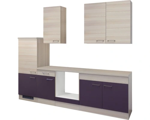 De combinatie van de kleur aubergine met het lichte acaciahouten dessin van front, corpus en werkblad vormt een ultramodern contrast, die van deze compacte keuken een echte eyecatcher maakt. De eenvoudige metalen grepen geven ook een mooie look.