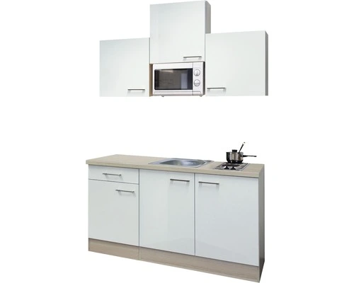 Maar ook de functionaliteit wordt niet verwaarloosd: alles wat in een keuken in principe nodig is, is samengevoegd in een ruimte van 150 cm. Op de tweepitskookplaat met snelkookzones kunnen snel lekkere maaltijden bereid worden en in de 46 cm grote roestvrijstalen gootsteen is ook de afwas geen probleem meer. De geïntegreerde 700 W magnetron met 6 standen en een praktische ontdooifunctie is een extra highlight. Drie 50 cm brede bovenkasten en een 50 cm brede onderkast met lade en elk met legplank bieden genoeg opbergruimte voor de kleine huishouding. Ook de 100 cm brede gootsteenkast biedt nog genoeg plek, bijv. voor je poetsspullen. Om de indeling van de keuken voor je te vereenvoudigen zijn de kastdeuren zowel voor links- als rechtszijdige montage geschikt.