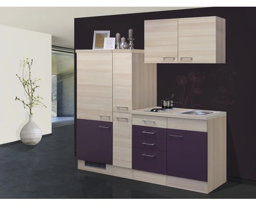 De combinatie van de kleur aubergine met het lichte acaciahouten dessin van front, corpus en werkblad vormt een ultramodern contrast, die van deze keuken een echte eyecatcher maakt. De eenvoudige metalen grepen geven ook een mooie look.