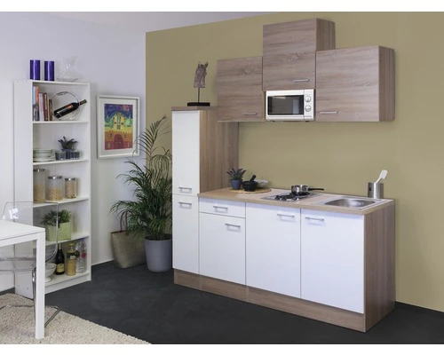Maar ook de functionaliteit wordt niet verwaarloosd: alles wat in een keuken in principe nodig is, is samengevoegd in een ruimte van 180 cm. Op de tweepitskookplaat met snelkookzones kunnen snel lekkere maaltijden bereid worden en in de 46 cm grote roestvrijstalen gootsteen is ook de afwas geen probleem meer. Bijzonder chic is de apothekerskast met twee lades en in totaal 4 legplanken. Drie 50 cm brede bovenkasten met legplanken en een 50 cm brede onderkast met lade en legplank bieden genoeg opbergruimte voor de kleine huishouding. Ook de 50 cm brede gootsteenkast biedt nog genoeg plek, bijv. voor je poetsspullen. Om de indeling van de keuken voor je te vereenvoudigen zijn de kastdeuren zowel voor links- als rechtszijdige montage geschikt.