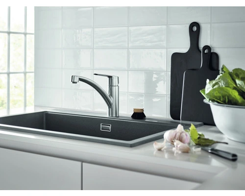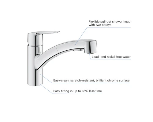 Met de GROHE Start eengreeps keukenkraan breng je je keuken snel en eenvoudig up-to-date dankzij het nieuwe montagesysteem. Deze designklassieker is opgefrist om te voldoen aan de eisen van moderne keukens en heeft nu een slank, modern profiel en beschikt over meer gebruikscomfort. Deze keukenkraan is ontworpen voor eengatsinstallatie en de lage uitloop kan soepel 150˚ worden gedraaid, wat meer flexibiliteit biedt aan de spoelbak zonder dat je op de muren spettert. De mousseur kan eenvoudig worden verwisseld met behulp van slechts een muntje – er komt dus geen gereedschap aan te pas. Binnenin zorgt de technologie van het GROHE SilkMove ES-cartouche voor een levenslange soepele en nauwkeurige bediening terwijl GROHE Zero geïsoleerde binnenwaterwegen zorgt ervoor dat je drinkwater lood- en nikkelvrij is. Een instelbare debietbegrenzer bespaart water en geld terwijl een geïntegreerde temperatuurbegrenzer verbranding voorkomt. De matte, slijtvaste GROHE StarLight-coating maakt gebruik van Physical Vapour Deposition (PVD) waardoor het tien keer meer krasbestendigheid heeft dan gewoon chroom. Met de GROHE QuickFix Plus-set kan de keukenkraan eenvoudig en snel worden geïnstalleerd, zonder dat je gereedschap nodig hebt.